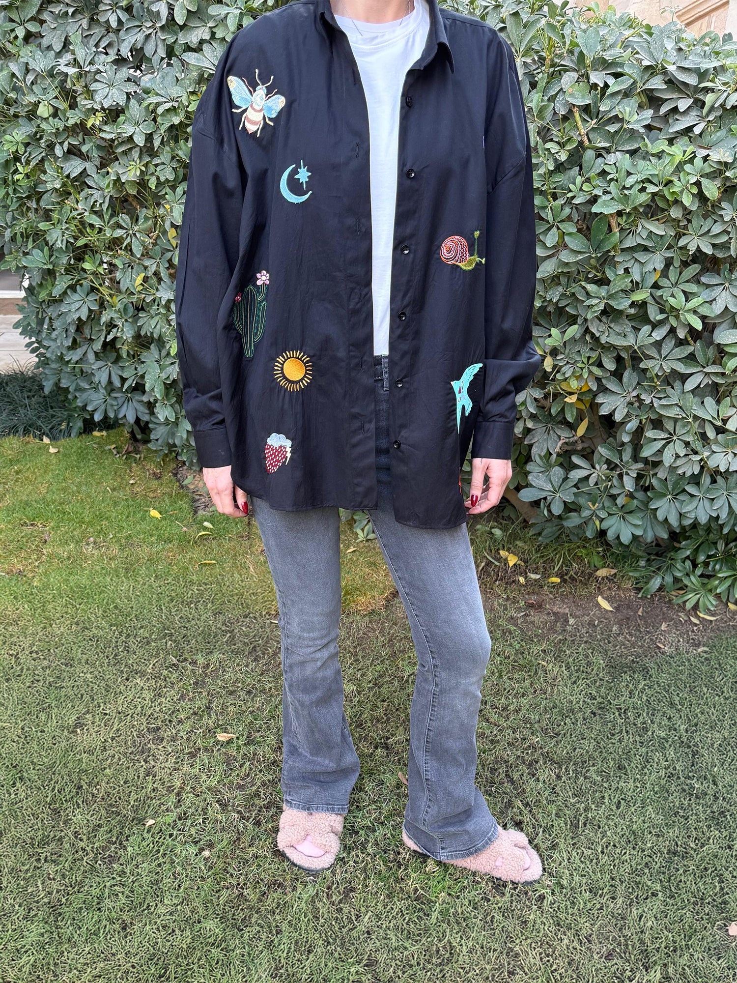 Our iconic signature piece in midnight black featuring our full collection of one-of-a-kind embroidered illustrations - brighter, bolder and designed to stand out while elevating your everyday wardrobe. Made from 100% Egyptian cotton, this statement piece effortlessly blends comfort with style.