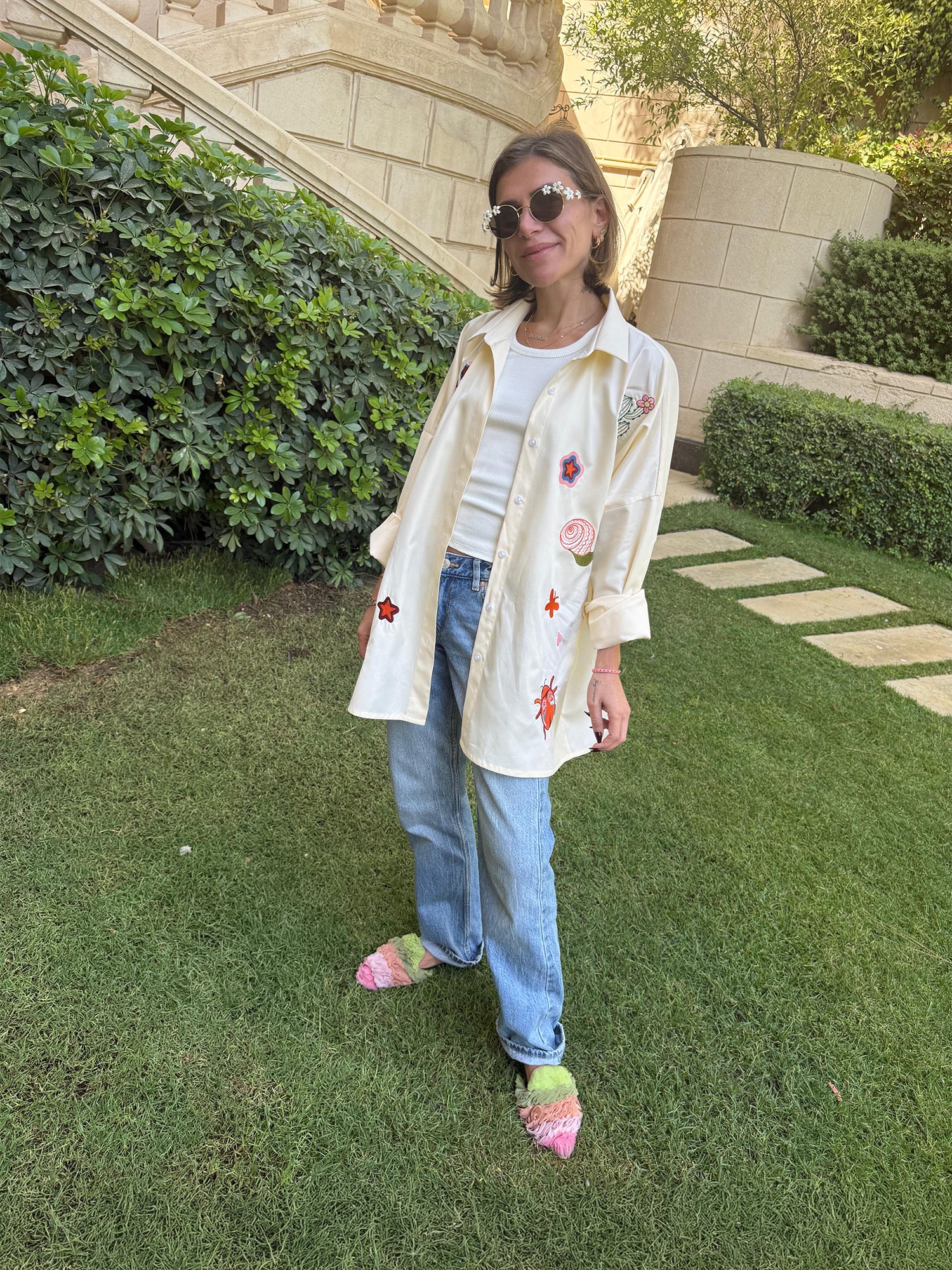 Our iconic signature piece in butter yellow featuring our full collection of one-of-a-kind embroidered illustrations - bigger, bolder and designed to elevate your everyday wardrobe and brighten your mood. Made from 100% Egyptian cotton, this statement piece effortlessly blends comfort with style.