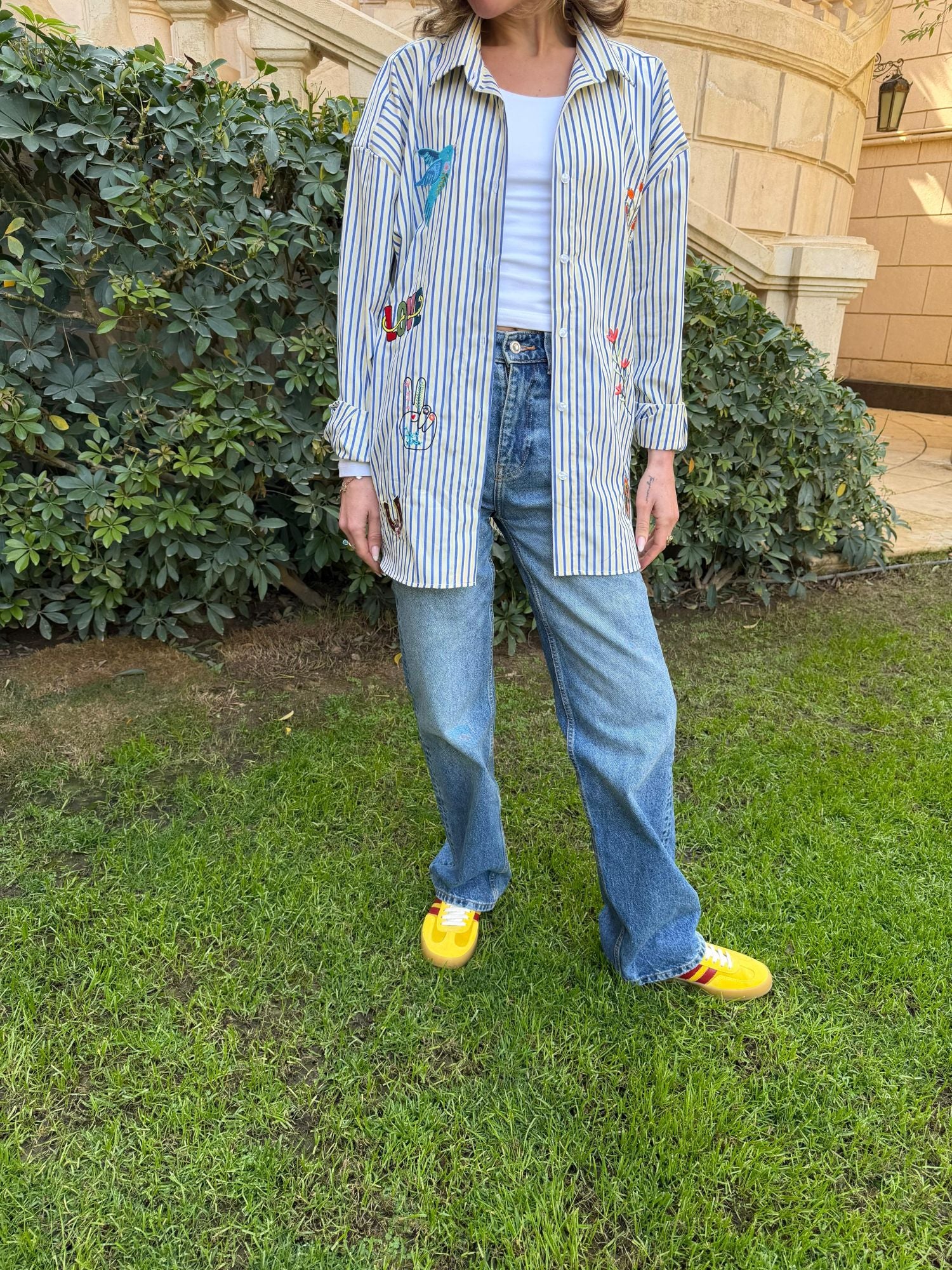 Proudly crafted from 100% breathable Egyptian cotton, this piece features a blue and yellow striped pattern, brought to life with our new spring, detailed embroidered illustrations for an edgy look. Inspired by the dragonfly - a symbol of personal growth, rebirth, and evolving into your true self.