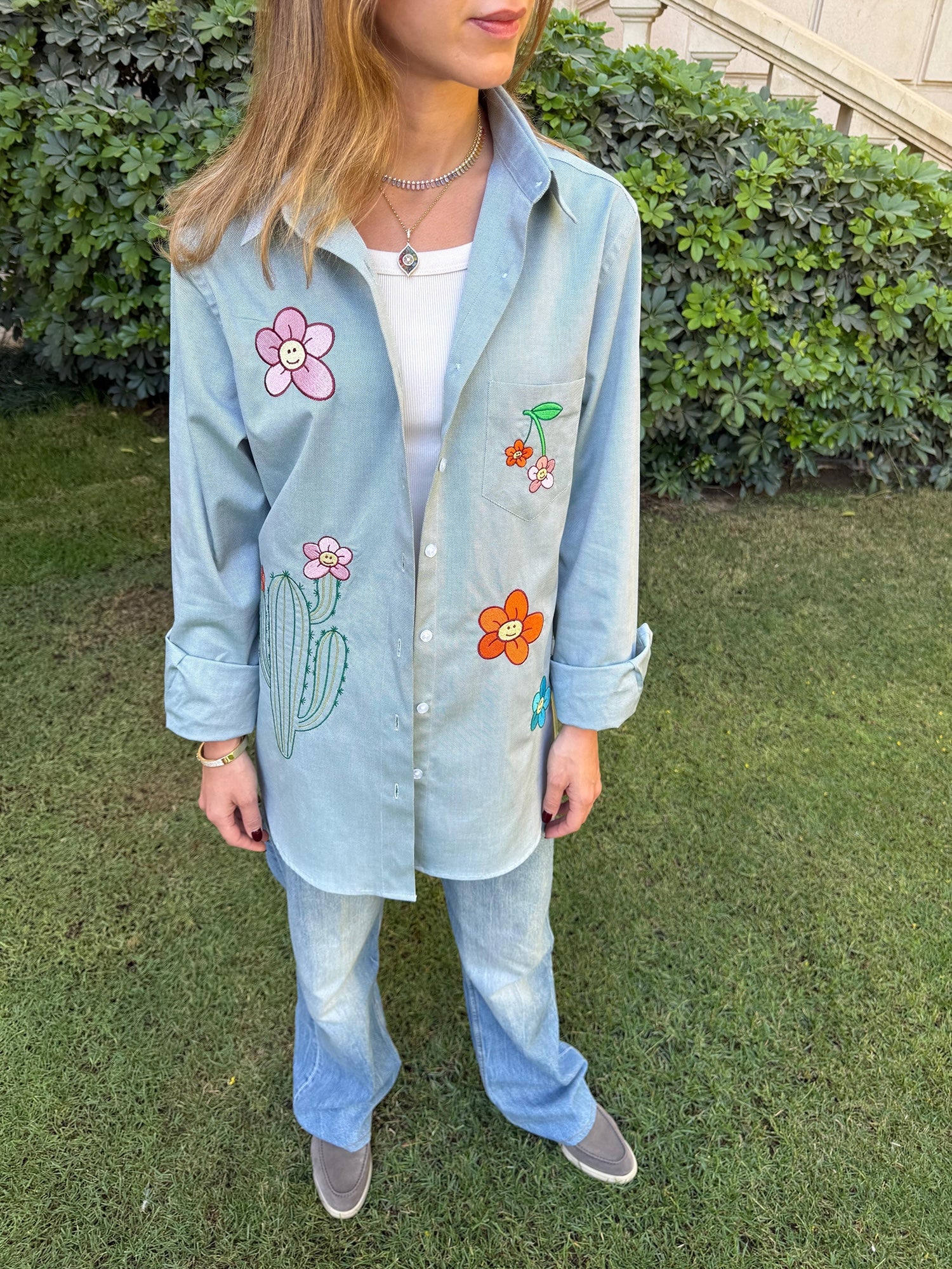 Our Groovy Green Shirt is a standout staple, featuring playful embroidery of our signature cactus motif. Crafted from 100% Egyptian cotton, it adds a pop of color and personality to your everyday wardrobe while effortlessly combining comfort and style.